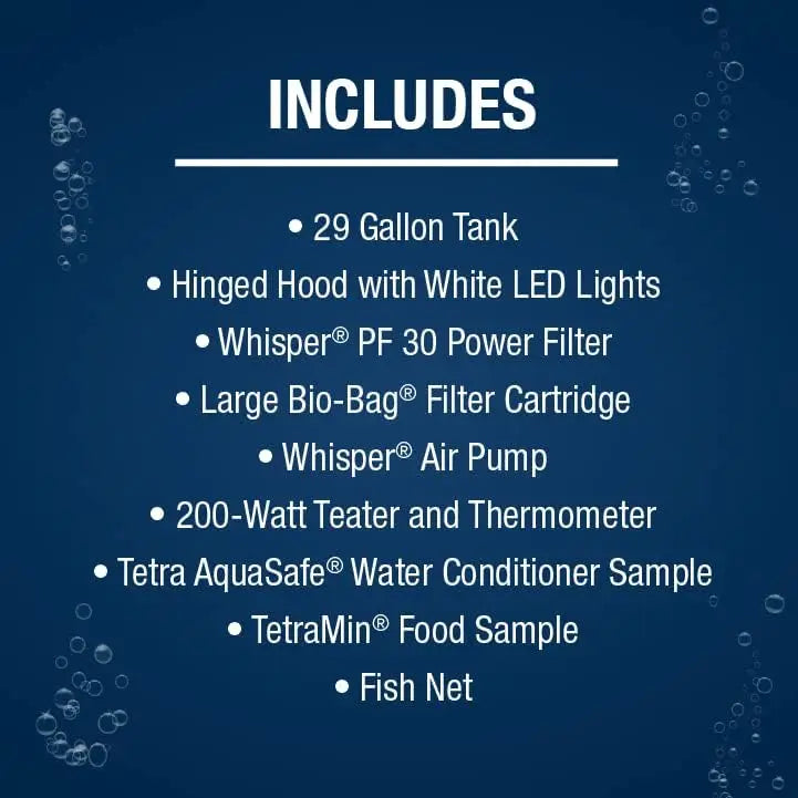 WITH HEATER: Includes a 200-watt heater and thermometer, along with a fish net, Tetra AquaSafe water conditioner sample, TetraMin food sample and setup guide
